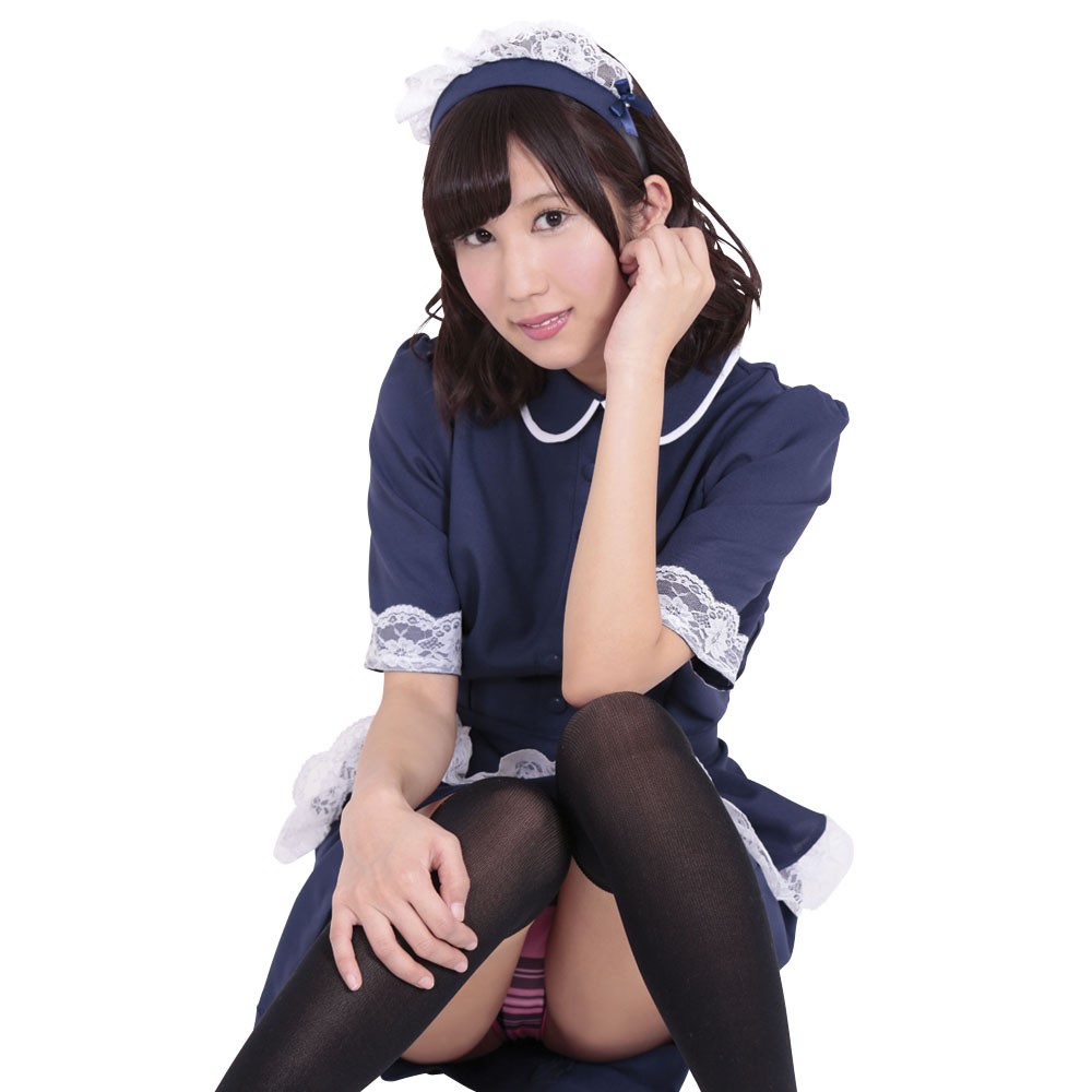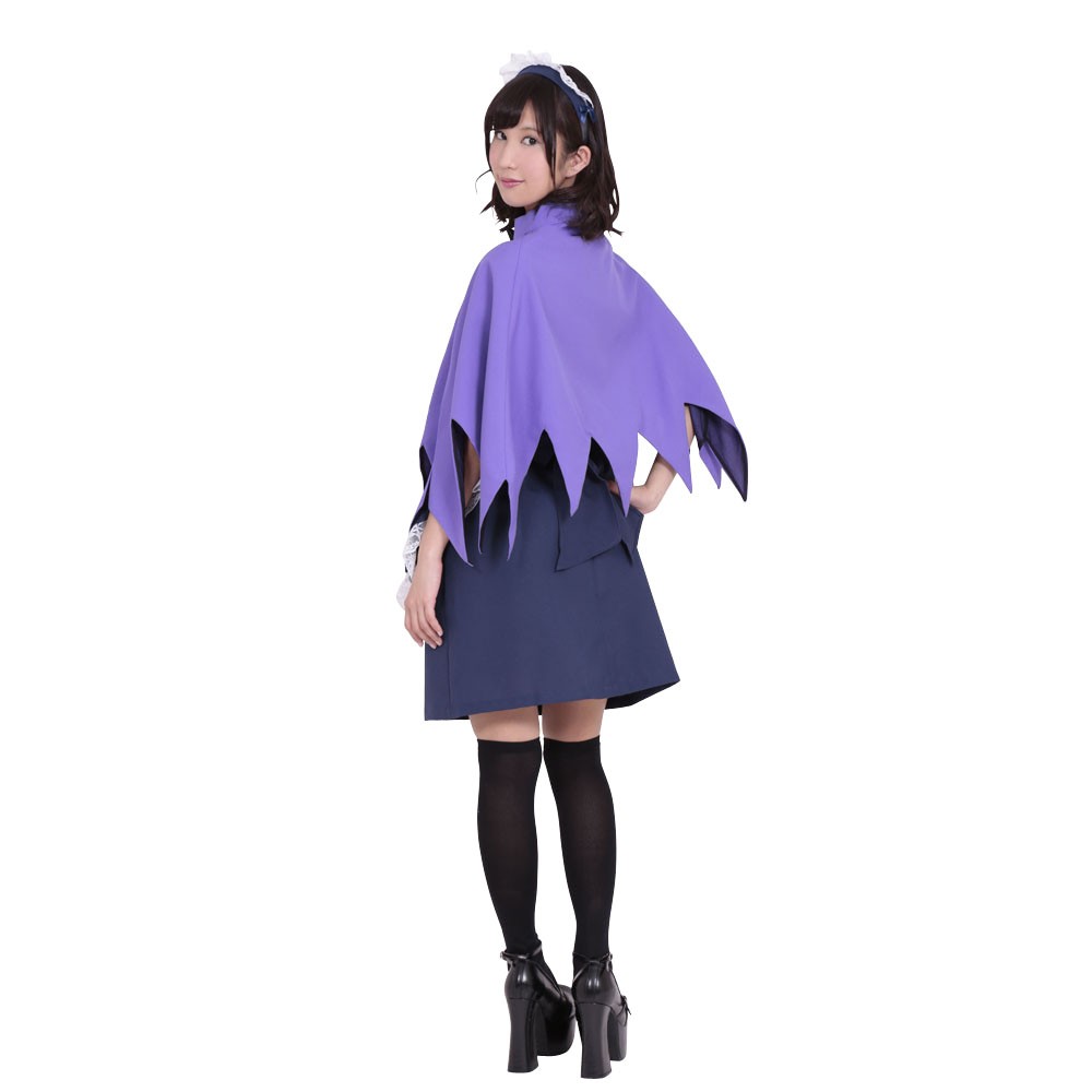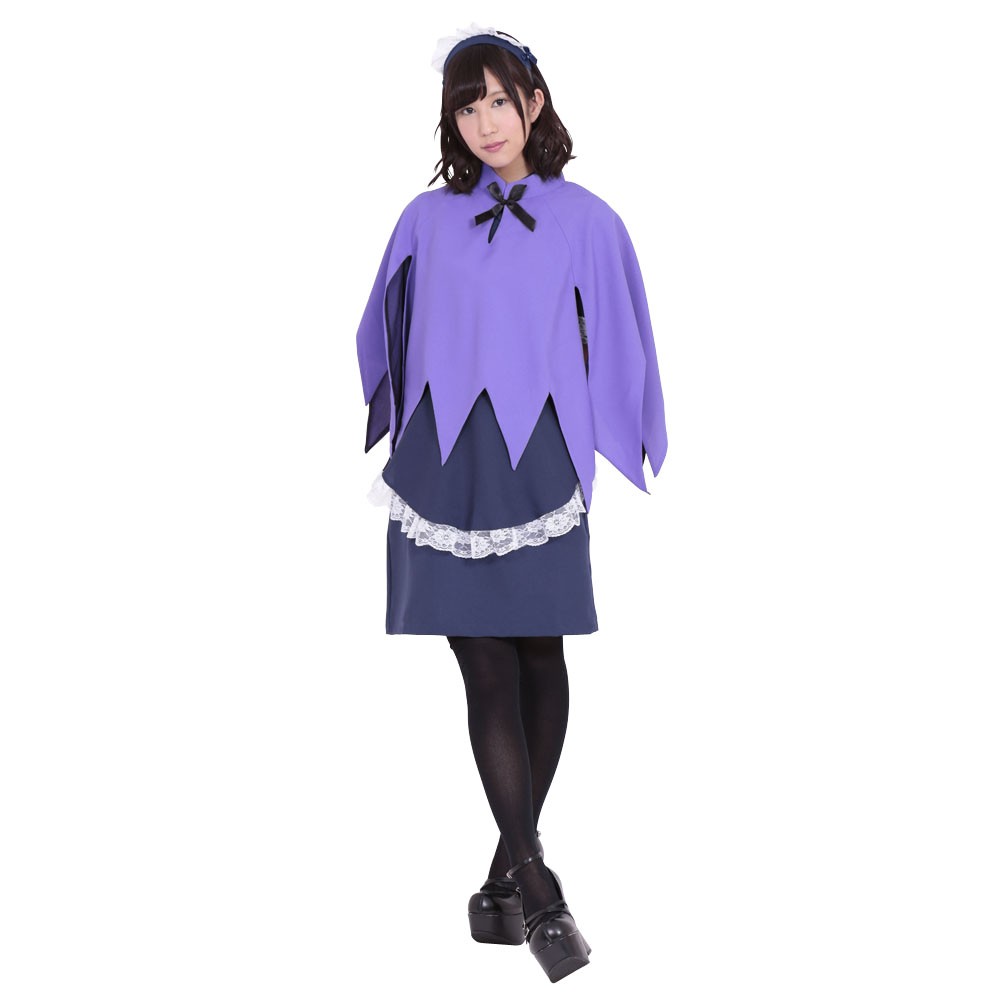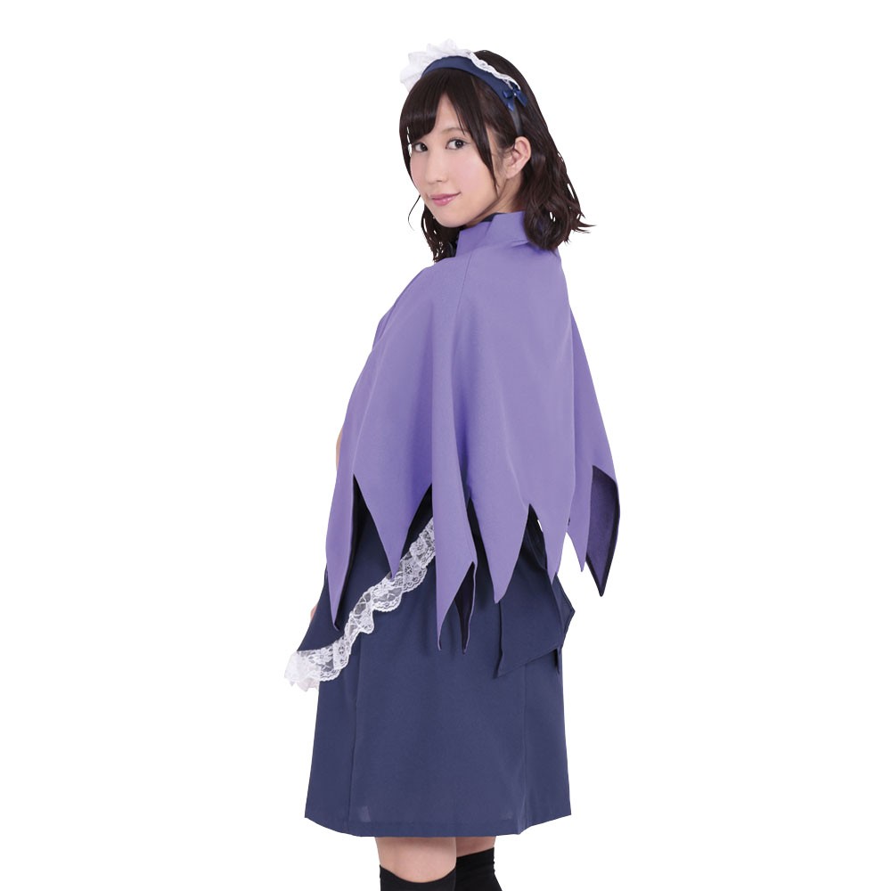 紺色ワンピース、紺色エプロン、紫マント、紺色カチューシャの4点セット。白のパイピングをほどこした丸衿、袖口に白レースをあしらったワンピース。白レースをあしらったエプロン。2個のサテンリボンと白レース付のカチューシャ。裾を16の三角にカットした明るめパープルのマントは首元にホックと黒サテンリボン付き。特別な日にふさわしいスペシャルメイドセットです。
