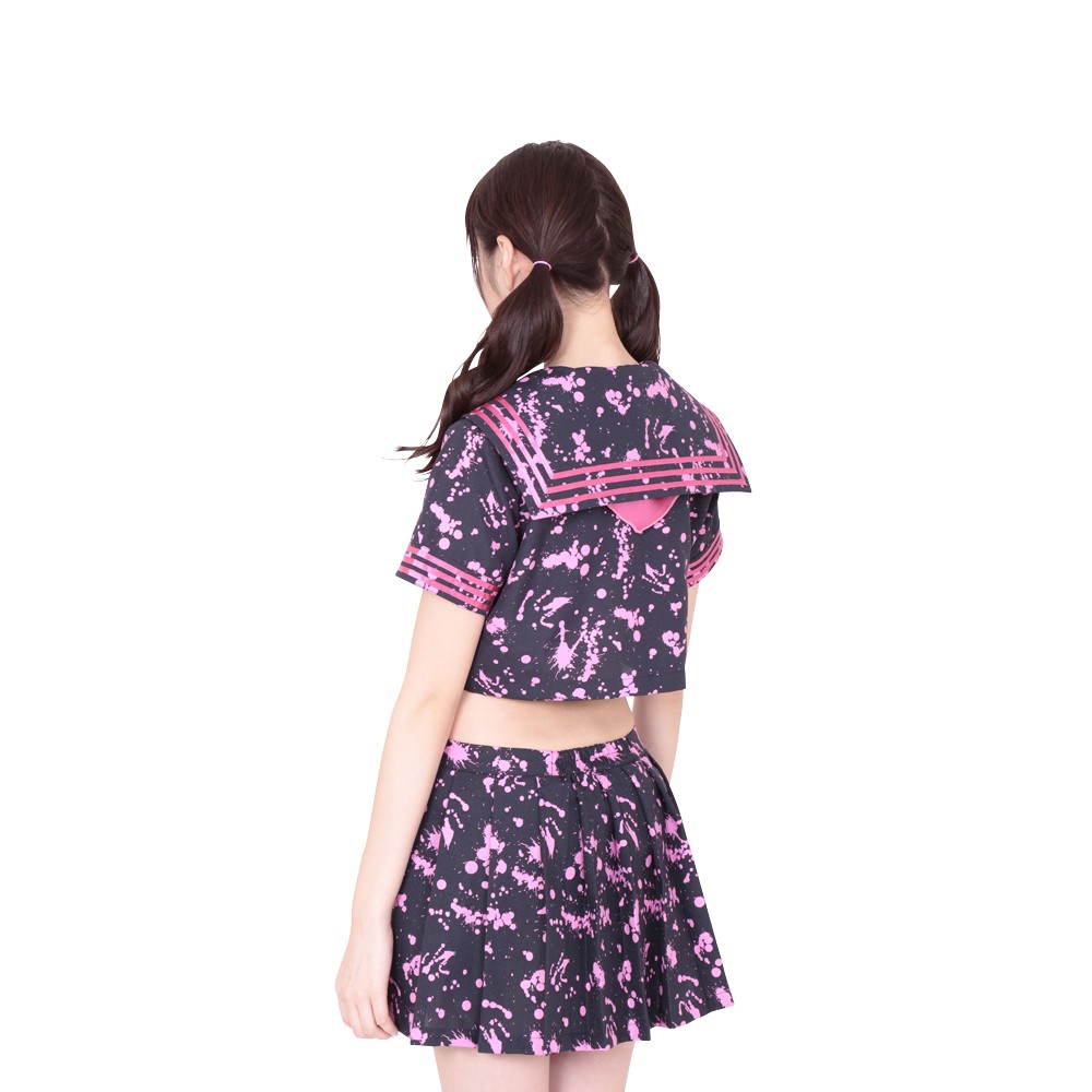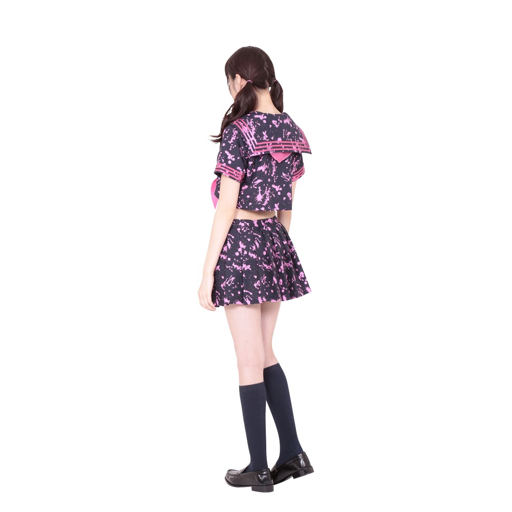黒のセーラー服にピンクをスプラッシュさせた上級者向き制服。セーラーカラーと袖口に7mmのピンクサテンリボンを縫い付けました。フロントの胸当ては2個のスナップ留め、センターに17cmのファスナー。スカーフ留にはブランドロゴの刺繍入り。19本のちょっと短めのプリーツスカート。120cmのピンクサテンスカーフ付。